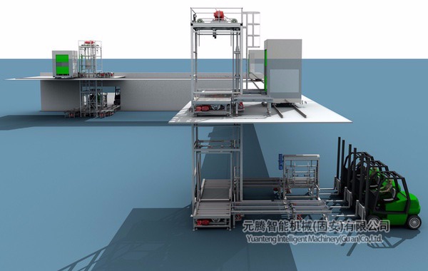 RGV軌道車+往復(fù)式提升機應(yīng)用+空中連廊