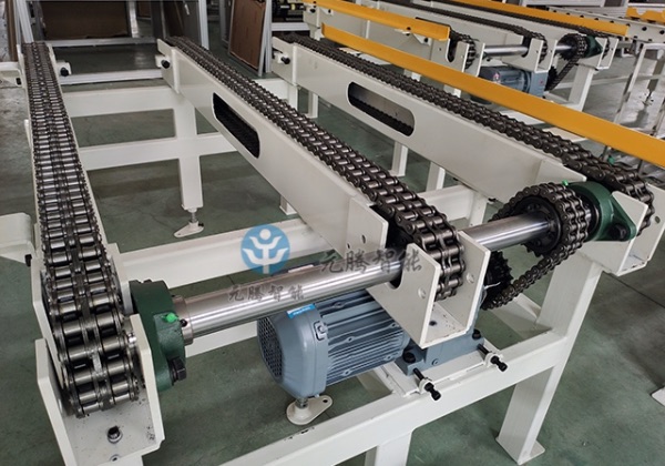 鏈條移載機是一般用于改變物品的輸送方向,將物品從叉道送入或移出主輸送線。具有承載大,結(jié)構(gòu)簡單,穩(wěn)定可靠的特點。在輥道輸送機,鏈條輸送機中,對于分揀速度小于30件/分鐘,但單件物品重量大于2000kg的物品,可選鏈條移載機。設(shè)備采用PLC可編程序控制,使得物品能方便地進出主輔輸送線,不會產(chǎn)生碰撞、擠壓等現(xiàn)象。我們開發(fā)的鏈條移載機采用四支點平衡鏈條,即使物品擺放不正,使設(shè)備側(cè)邊或一角受力,依然能順利升降,不存在阻滯或卡死現(xiàn)象。