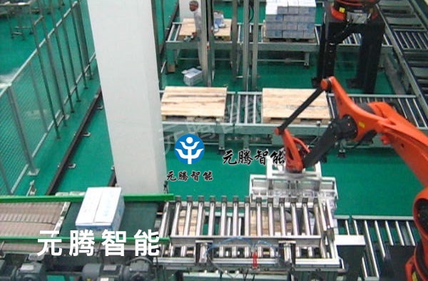 機器人碼垛機單元,包括機械臂,抓手,整形機,上料輸送機,垛盤輸送裝置,垛型5袋/層*8層(碼垛機器人可根據現(xiàn)場要求安排垛型)。設置兩個垛盤位置,1號垛盤碼放滿后,這種碼垛機器人的機械臂繼續(xù)碼放2號位置垛盤,同時叉車把1號垛盤叉走,然后放置一個空垛盤。